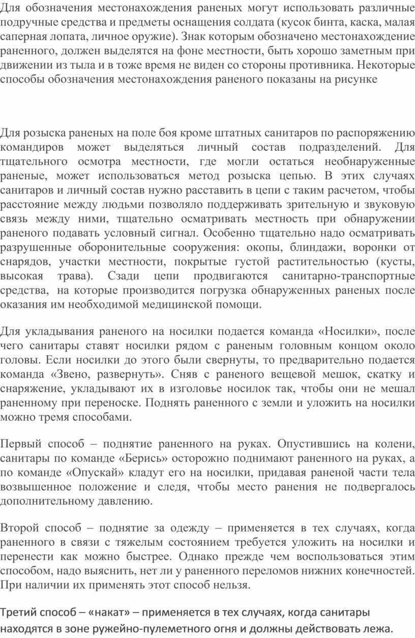 Указанные способы применяются для оттаскивания раненых на короткие расстояния (5-10 м) в укрытия, где им не грозит опасность вторичного ранения и откуда их можно выносить на носилках или вывозить транспортными средствами.