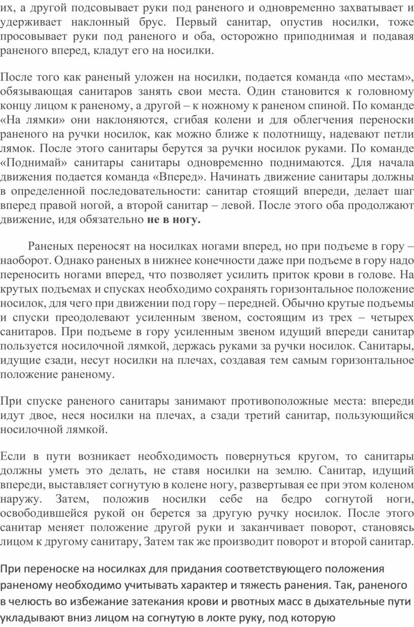 При переноске на носилках для придания соответствующего положения раненому необходимо учитывать характер и тяжесть ранения. Так, раненого в челюсть во избежание затекания крови и рвотных масс в дыхательные пути укладывают вниз лицом на согнутую в локте руку, под которую подкладывают скатку шинели или вещевой мешок. При повреждении позвоночника раненого переносят на носилках, поверх которых укреплен лист толстой фанеры или широкая легкая доска, на которые и укладывают раненого.