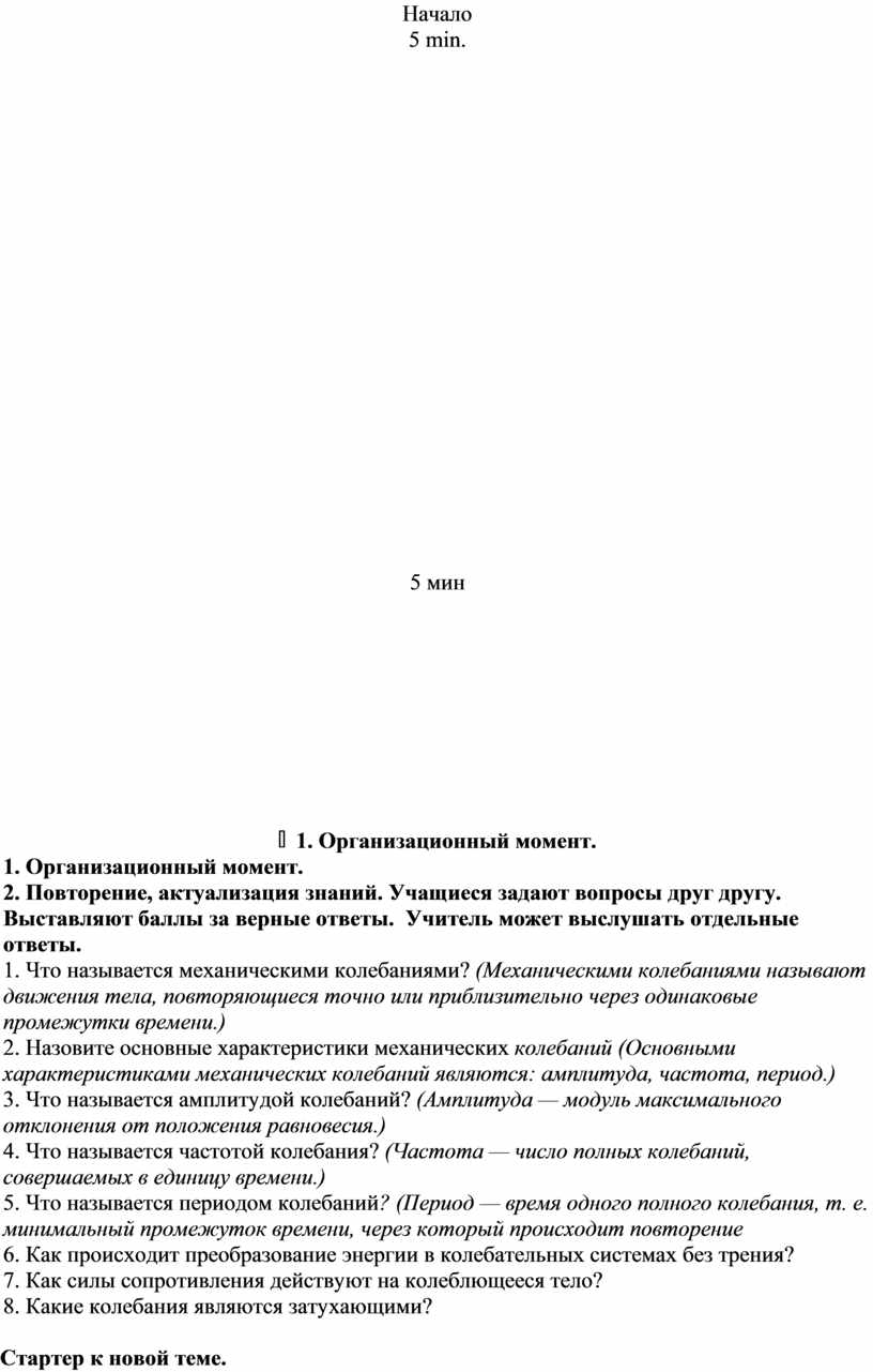 1. Организационный момент. 2. Повторение, актуализация знаний. Учащиеся задают вопросы друг другу. Выставляют баллы за верные ответы. Учитель может выслушать отдельные ответы. 1. Что называется механическими колебаниями? (Механическими колебаниями называют движения тела, повторяющиеся точно или приблизительно через одинаковые промежутки времени.) 2. Назовите основные характеристики механических колебаний (Основными характеристиками механических колебаний являются: амплитуда, частота, период.) 3. Что называется амплитудой колебаний? (Амплитуда — модуль максимального отклонения от положения равновесия.) 4. Что называется частотой колебания? (Частота — число полных колебаний, совершаемых в единицу времени.) 5. Что называется периодом колебаний? (Период — время одного полного колебания, т. е. минимальный промежуток времени, через который происходит повторение 6. Как происходит преобразование энергии в колебательных системах без трения? 7. Как силы сопротивления действуют на колеблющееся тело? 8. Какие колебания являются затухающими?