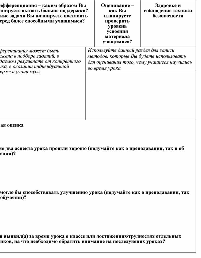 Используйте данный раздел для записи методов, которые Вы будете использовать для оценивания того, чему учащиеся научились во время урока. |