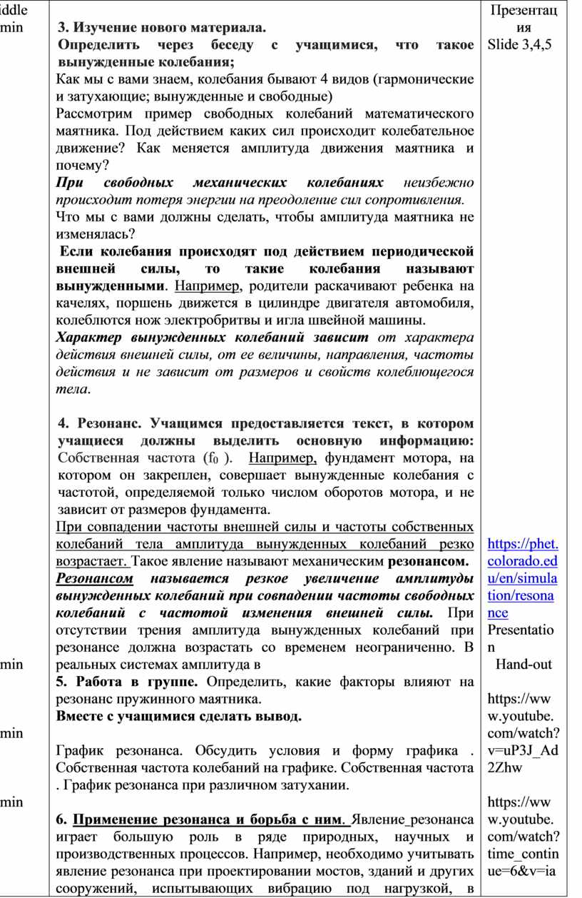 4. Резонанс. Учащимся предоставляется текст, в котором учащиеся должны выделить основную информацию: Собственная частота (f0 ). Например, фундамент мотора, на котором он закреплен, совершает вынужденные колебания с частотой, определяемой только числом оборотов мотора, и не зависит от размеров фундамента. При совпадении частоты внешней силы и частоты собственных колебаний тела амплитуда вынужденных колебаний резко возрастает. Такое явление называют механическим резонансом. Резонансом называется резкое увеличение амплитуды вынужденных колебаний при совпадении частоты свободных колебаний с частотой изменения внешней силы. При отсутствии трения амплитуда вынужденных колебаний при резонансе должна возрастать со временем неограниченно. В реальных системах амплитуда в 5. Работа в группе. Определить, какие факторы влияют на резонанс пружинного маятника. Вместе с учащимися сделать вывод.