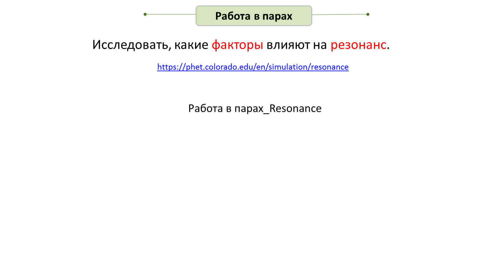 Предположим, что на систему действует гармонически изменяющаяся внешняя сила, называемая «движущей силой». Частота движущей силы f. При f = f0 амплитуда колебаний резко возрастает.