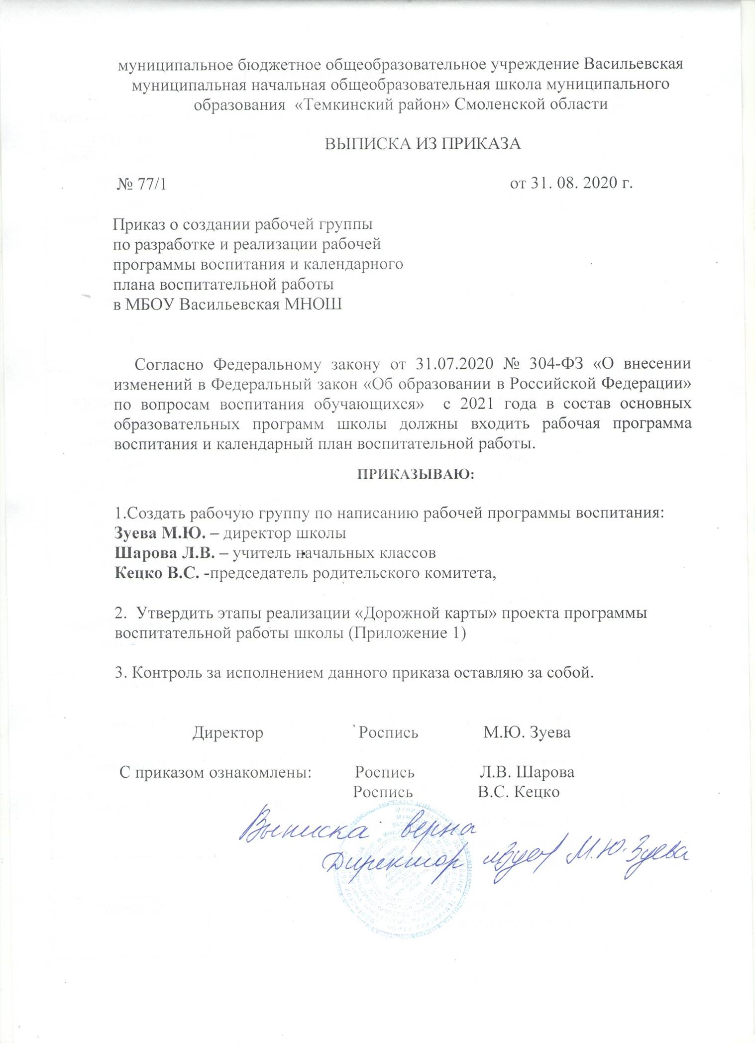 Выписка из приказа № 77/1 от 31.08.2020 г.