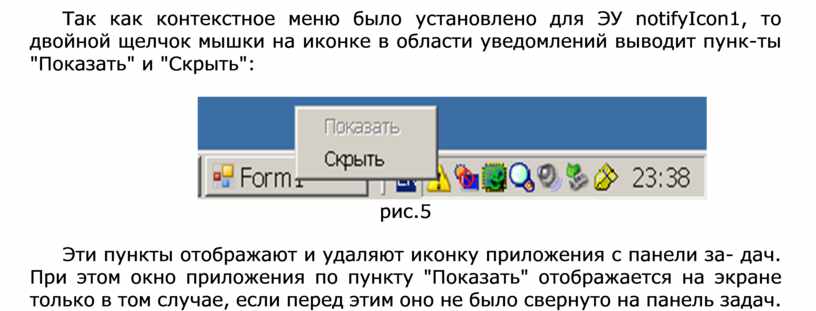 Эти пункты отображают и удаляют иконку приложения с панели за- дач. При этом окно приложения по пункту "Показать" отображается на экране только в том случае, если перед этим оно не было свернуто на панель задач.