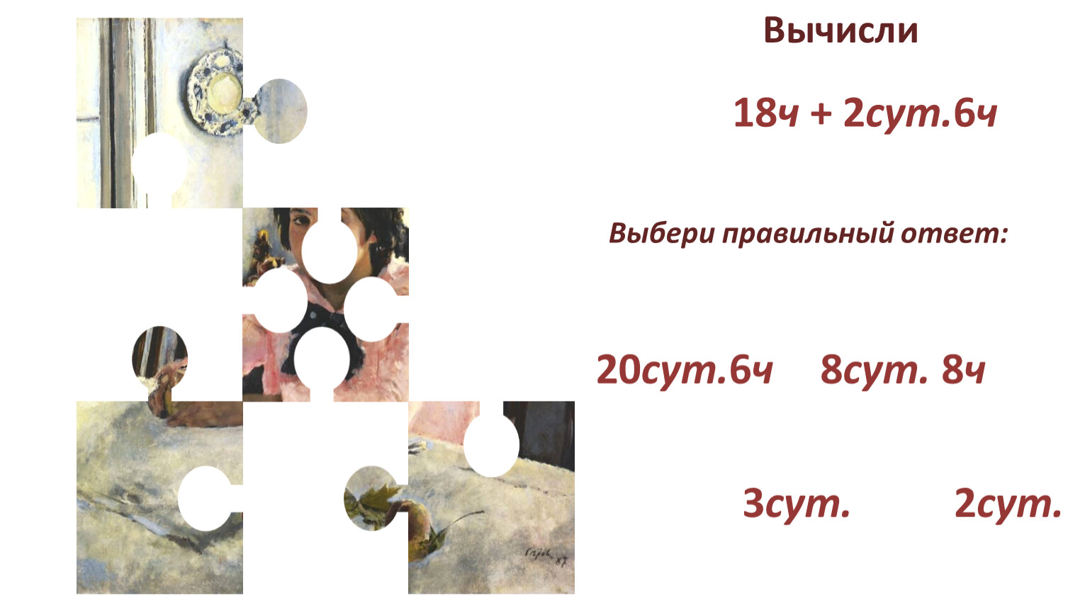 Предлагаю вашему вниманию математический тренажёр. Ваша задача: собрать из фрагментов картину. Для это решайте примеры, выбирайте правильный ответ и кликайте по нему. С каждым, правильно решённым примером, будет открываться часть картины русского живописца Валентина Серова «Девочка с персиками».