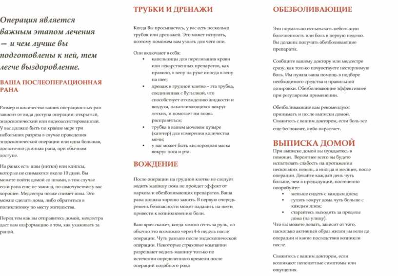 Это нормально испытывать небольшую болезненность или боль в первую неделю. Вы должны получать обезболивающие препараты. Сообщите вашему доктору или медсестре сразу, как только почувствуете нестерпимую боль. Им нужна ваша помощь в подборе необходимого средства и правильной дозировки. Обезболивающие эффективнее при регулярном применении. Обезболивающие вам рекомендуют принимать и после выписки домой. Свяжитесь с вашим доктором, если боль все еще беспокоит, либо нарастает. ВЫПИСКА ДОМОЙПри выписке домой вы нуждаетесь в помощи. Вероятнее всего вы будете испытывать слабость на протяжении нескольких недель, а иногда и месяцев, после операции. Делайте каждый день чуть больше, чем в предыдущий, постепенно попробуйте: ▪ меньше сидеть с каждым днем; ▪ гулять вокруг дома чуть больше с каждым днем; ▪ старайтесь выходить за пределы дома (на улицу). Что вы можете делать, зависит от того, насколько активный образ жизни вы вели до операции и какие последствия возникли после. Свяжитесь с вашим доктором, если возникают непонятные симптомы или ощущения.
