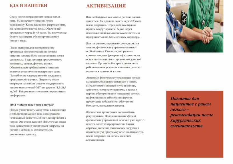 Сразу после операции вам нельзя есть и пить. Вы получаете питание через капельницу. Когда вам вновь разрешат пить, вы начинаете с глотка воды. Обычно это происходит через 24-48 часов. Вы постепенно будете расширять объем принимаемой пищи и воды. После выписки для восстановления организма после операции на легком питание должно быть полноценным, легко усвояемым. В еде должны присутствовать витамины, овощи, фрукты и соки. Обязательным требованием к питанию является ограничение поваренной соли. Потребление хлорида натрия не должно превышать 6 г в сутки. Пациенту после операции на легком следует поддерживать индекс массы тела (ИМТ) на уровне 18,5–24,9 кг/м2 . Индекс массы тела можно рассчитать по формуле: ИМТ = Масса тела / рост в метрах2Нельзя увеличивать массу тела, а пациентам с избыточной массой тела и ожирением необходимо обязательно свой вес привести к норме. Это очень важно!!! Избыточная масса тела существенно увеличивает нагрузку на легкие и сердце, и, следовательно, увеличивает одышку.