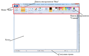 Графический редактор — это программа, предназначенная для создания картинок, поздравительных открыток, рекламных объявлений, приглашений, иллюстраций к докладам и других изображений. После запуска графического редактора Paint на экране компьютера открывается его окно, основные элементы которого показаны на рис.
