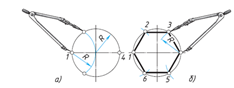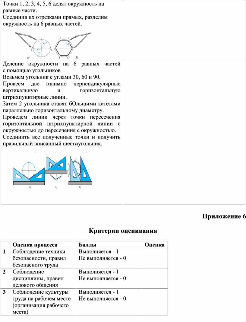Деление окружности на 6 равных частей Возьмем угольник с углами 30, 60 и 90. Провеем две взаимно перпендикулярные вертикальную и горизонтальную штрихпунктирные линии. Затем 2 угольника ставят бОльшими катетами параллельно горизонтальному диаметру. Проведем линии через точки пересечения горизонтальной штрихпунктирной линии с окружностью до пересечения с окружностью. Соединить все полученные точки и получить правильный вписанный шестиугольник.