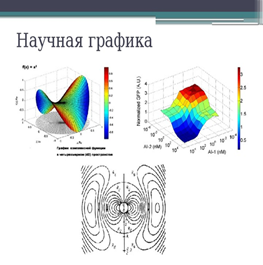 Научная графика Первые компьютеры использовались лишь для решения научных и производственных задач. Чтобы лучше понять полученные результаты, производили их графическую обработку, строили графики, диаграммы, чертежи рассчитанных конструкций (Рисунок 4). Первые графики на машине получали в режиме символьной печати. Затем появились специальные устройства – графопостроители (плоттеры) для вычерчивания чертежей и графиков чернильным пером на бумаге. Современная научная компьютерная графика дает возможность проводить Рисунок 4. Научная графика вычислительные эксперименты с наглядным представлением их результатов. |