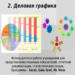 Деловая графика Деловая графика – область компьютерной графики, предназначенная для наглядного представления различных показателей работы учреждений. Плановые показатели, отчетная документация, статистические сводки – вот объекты, для которых с помощью деловой графики создаются иллюстративные материалы. Программные средства деловой графики включаются в состав электронных таблиц |