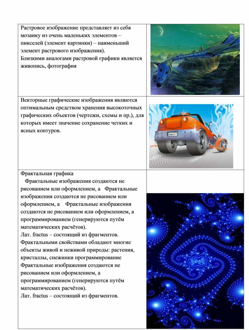 систематизирование представлений о видах компьютерной графики, их особенностях, достоинствах и недостатках;