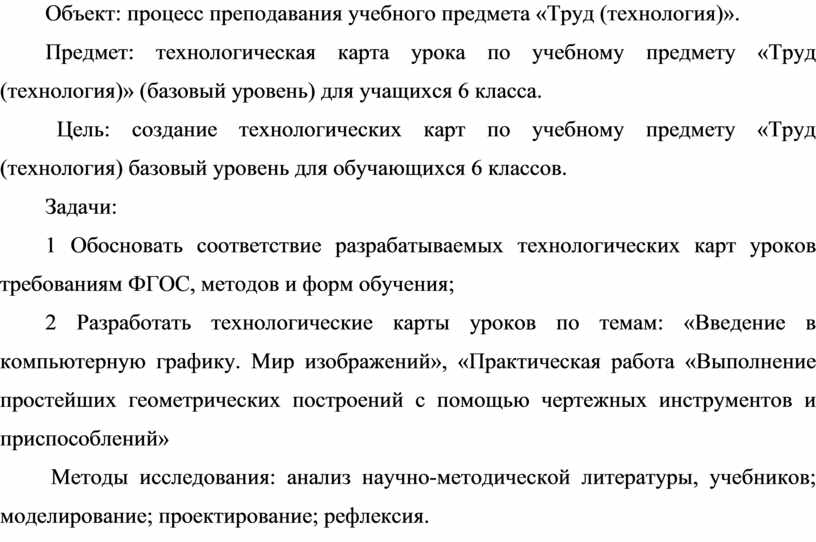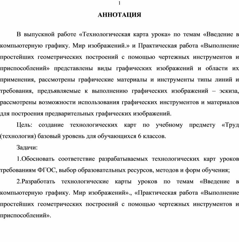 Выпускная работа содержит две технологические карты по учебному предмету «Труд (технология)»: технологическая карта урока по теме «Введение в компьютерную графику. Мир изображений.» (6класс) и технологическая карта урока по теме «Практическая работа «Выполнение простейших геометрических построений с помощью чертежных инструментов и приспособлений» (6 класс).
