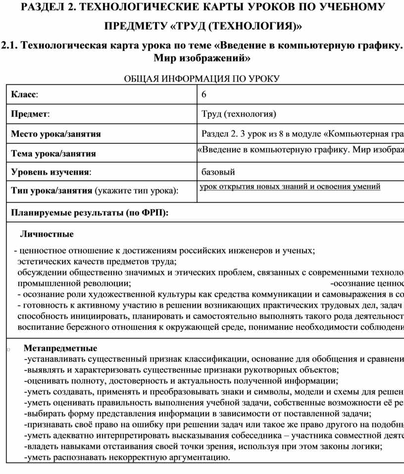 РАЗДЕЛ 2. ТЕХНОЛОГИЧЕСКИЕ КАРТЫ УРОКОВ ПО УЧЕБНОМУ ПРЕДМЕТУ «ТРУД (ТЕХНОЛОГИЯ)»