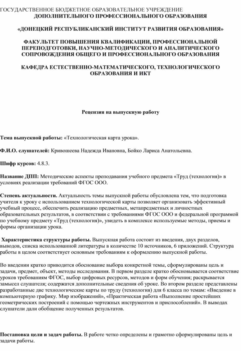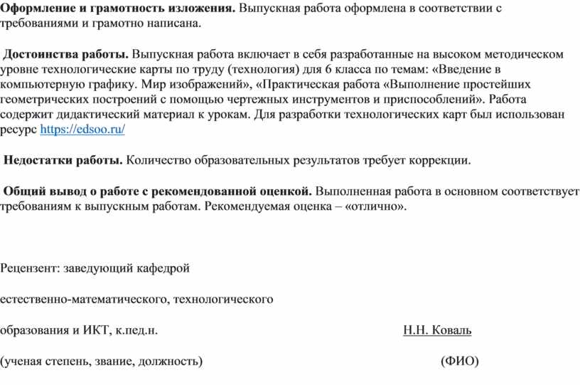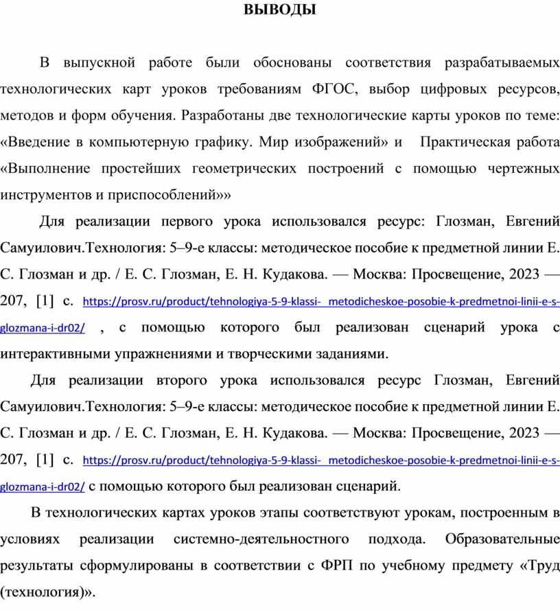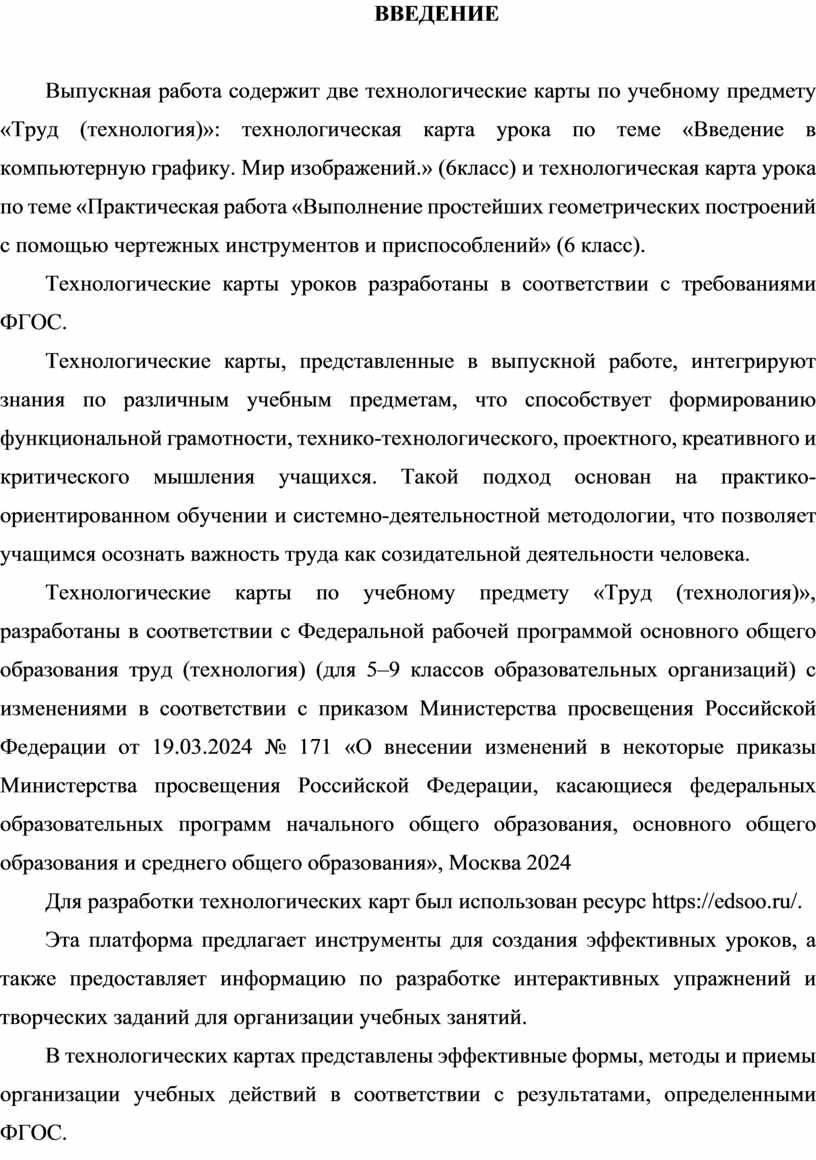 Достоинства работы. Выпускная работа включает в себя разработанные на высоком методическом уровне технологические карты по труду (технология) для 6 класса по темам: «Введение в компьютерную графику. Мир изображений», «Практическая работа «Выполнение простейших геометрических построений с помощью чертежных инструментов и приспособлений». Работа содержит дидактический материал к урокам. Для разработки технологических карт был использован ресурс https://edsoo.ru/