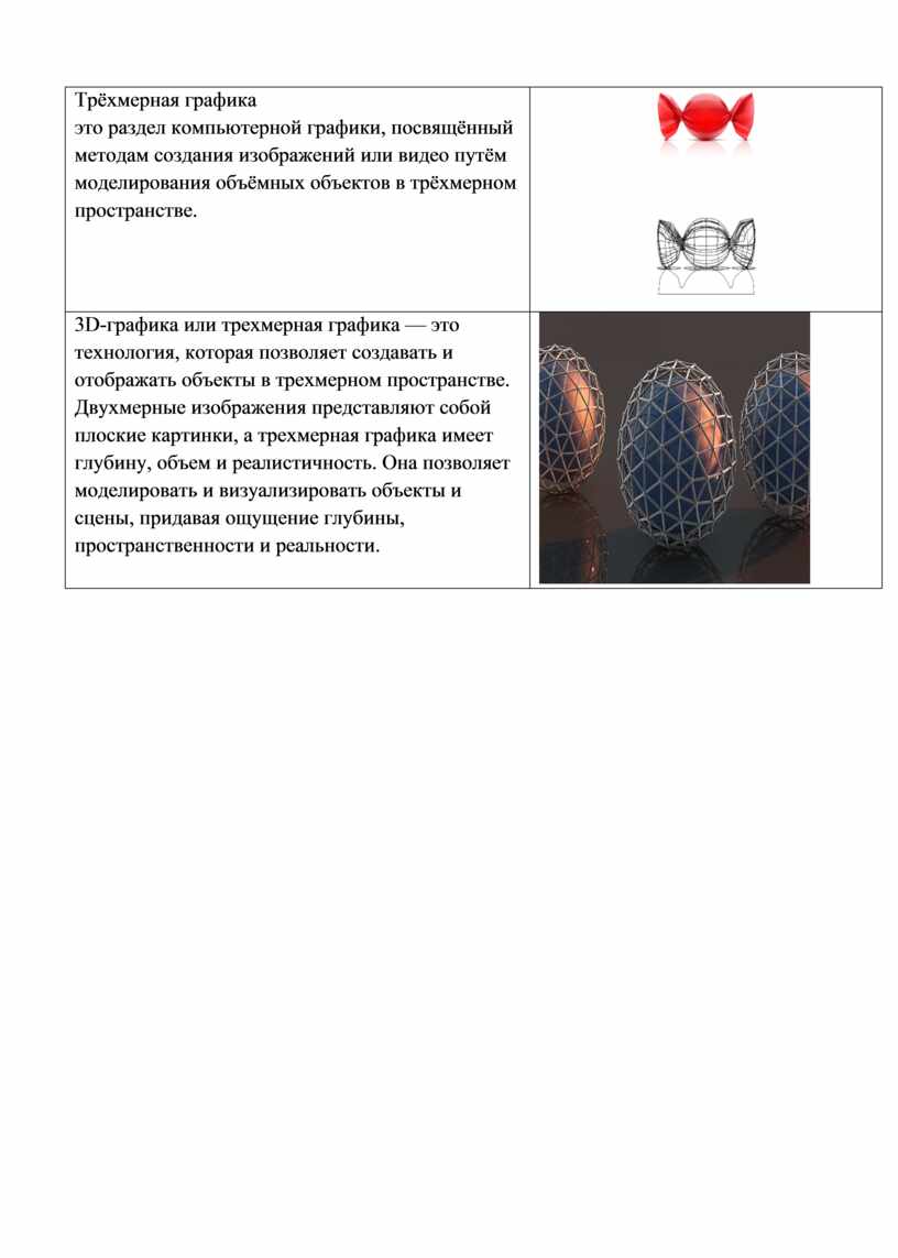 3D-графика или трехмерная графика — это технология, которая позволяет создавать и отображать объекты в трехмерном пространстве. Двухмерные изображения представляют собой плоские картинки, а трехмерная графика имеет глубину, объем и реалистичность. Она позволяет моделировать и визуализировать объекты и сцены, придавая ощущение глубины, пространственности и реальности. |