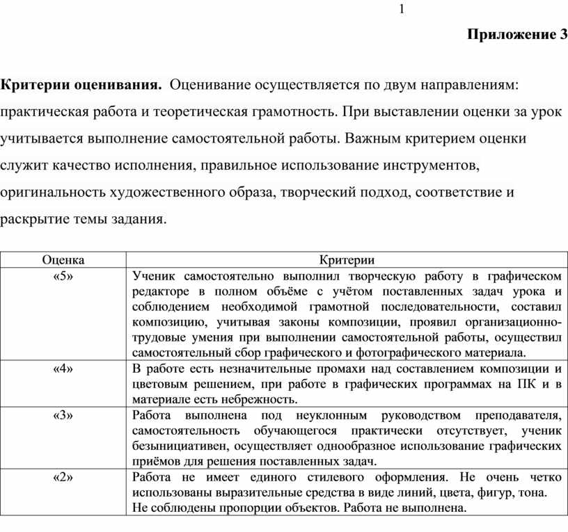 Критерии оценивания. Оценивание осуществляется по двум направлениям: практическая работа и теоретическая грамотность. При выставлении оценки за урок учитывается выполнение самостоятельной работы. Важным критерием оценки служит качество исполнения, правильное использование инструментов, оригинальность художественного образа, творческий подход, соответствие и раскрытие темы задания.