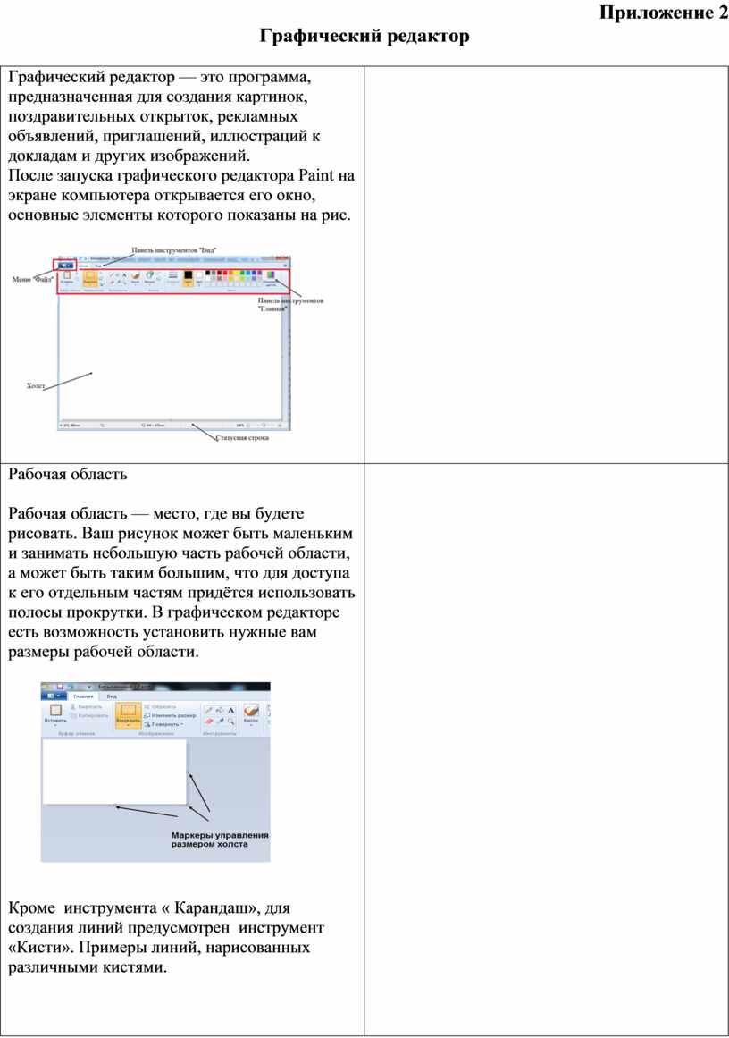 Рабочая область — место, где вы будете рисовать. Ваш рисунок может быть маленьким и занимать небольшую часть рабочей области, а может быть таким большим, что для доступа к его отдельным частям придётся использовать полосы прокрутки. В графическом редакторе есть возможность установить нужные вам размеры рабочей области.