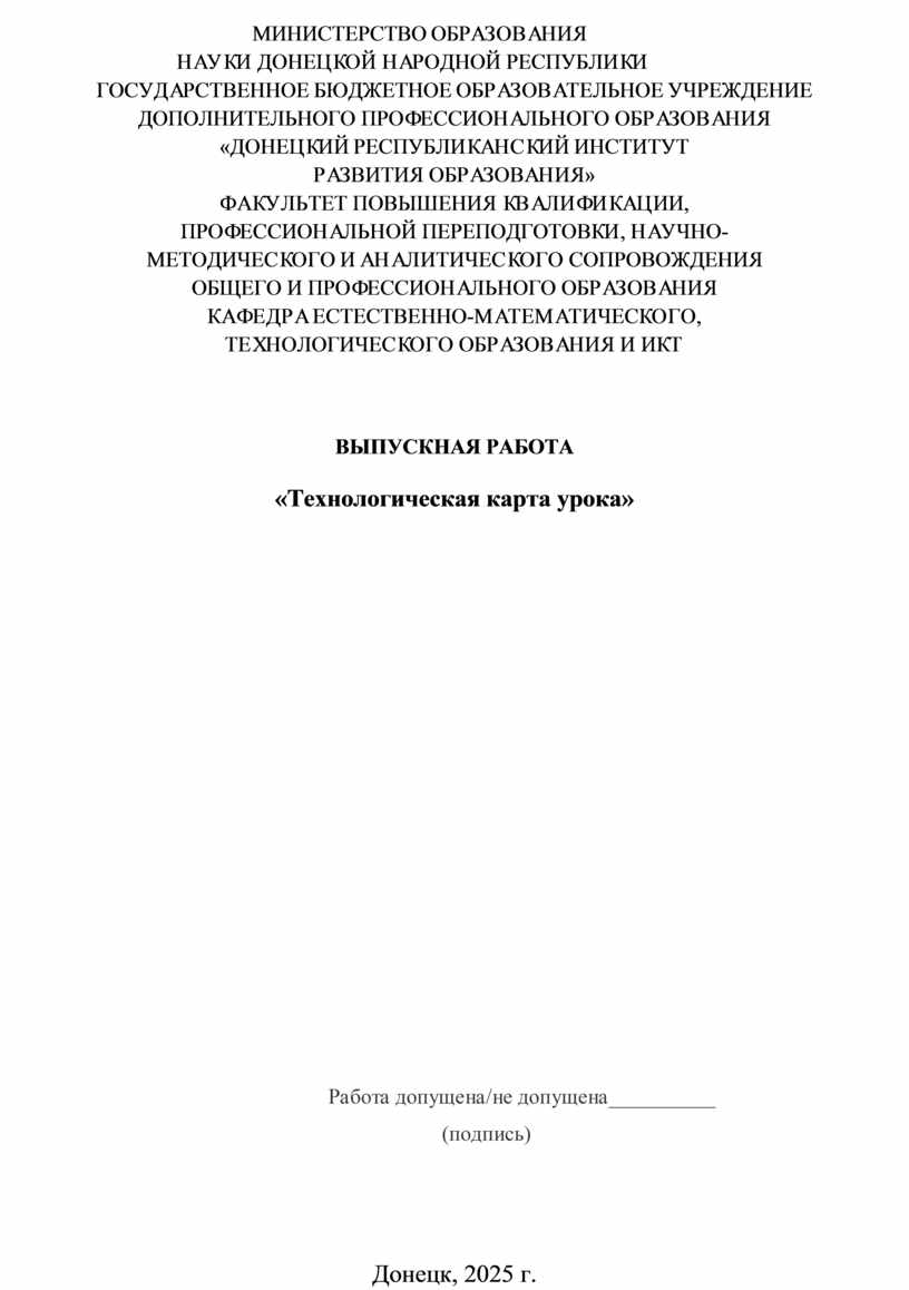 Степень актуальности. Актуальность темы выпускной работы обусловлена тем, что подготовка учителя к уроку с использованием технологической карты позволяет организовать эффективный учебный процесс, обеспечить реализацию предметных, метапредметных и личностных образовательных результатов, в соответствии с требованиями ФГОС ООО и федеральной программой по учебному предмету «Труд (технология)», увидеть в комплексе используемые методы, приемы и формы организации урока.