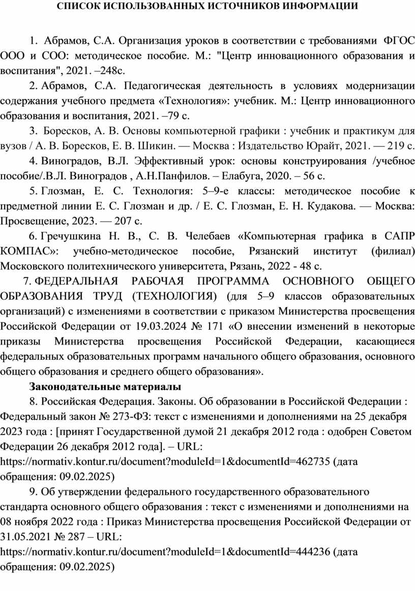 8. Российская Федерация. Законы. Об образовании в Российской Федерации : Федеральный закон № 273-ФЗ: текст с изменениями и дополнениями на 25 декабря 2023 года : [принят Государственной думой 21 декабря 2012 года : одобрен Советом Федерации 26 декабря 2012 года]. – URL: https://normativ.kontur.ru/document?moduleId=1&documentId=462735 (дата обращения: 09.02.2025)