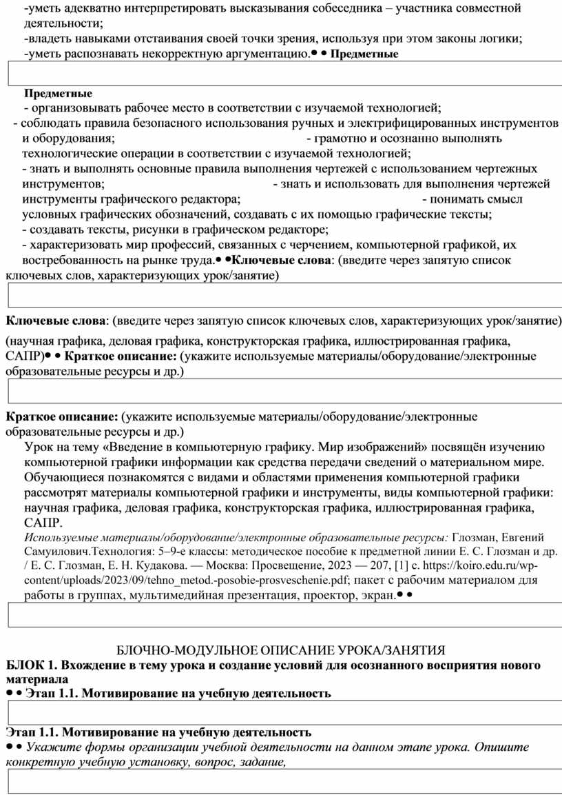 Краткое описание: (укажите используемые материалы/оборудование/электронные образовательные ресурсы и др.) Урок на тему «Введение в компьютерную графику. Мир изображений» посвящён изучению компьютерной графики информации как средства передачи сведений о материальном мире. Обучающиеся познакомятся с видами и областями применения компьютерной графики рассмотрят материалы компьютерной графики и инструменты, виды компьютерной графики: научная графика, деловая графика, конструкторская графика, иллюстрированная графика, САПР. Используемые материалы/оборудование/электронные образовательные ресурсы: Глозман, Евгений Самуилович.Технология: 5–9-е классы: методическое пособие к предметной линии Е. С. Глозман и др. / Е. С. Глозман, Е. Н. Кудакова. — Москва: Просвещение, 2023 — 207, [1] с. https://koiro.edu.ru/wp-content/uploads/2023/09/tehno_metod.-posobie-prosveschenie.pdf; пакет с рабочим материалом для работы в группах, мультимедийная презентация, проектор, экран. |