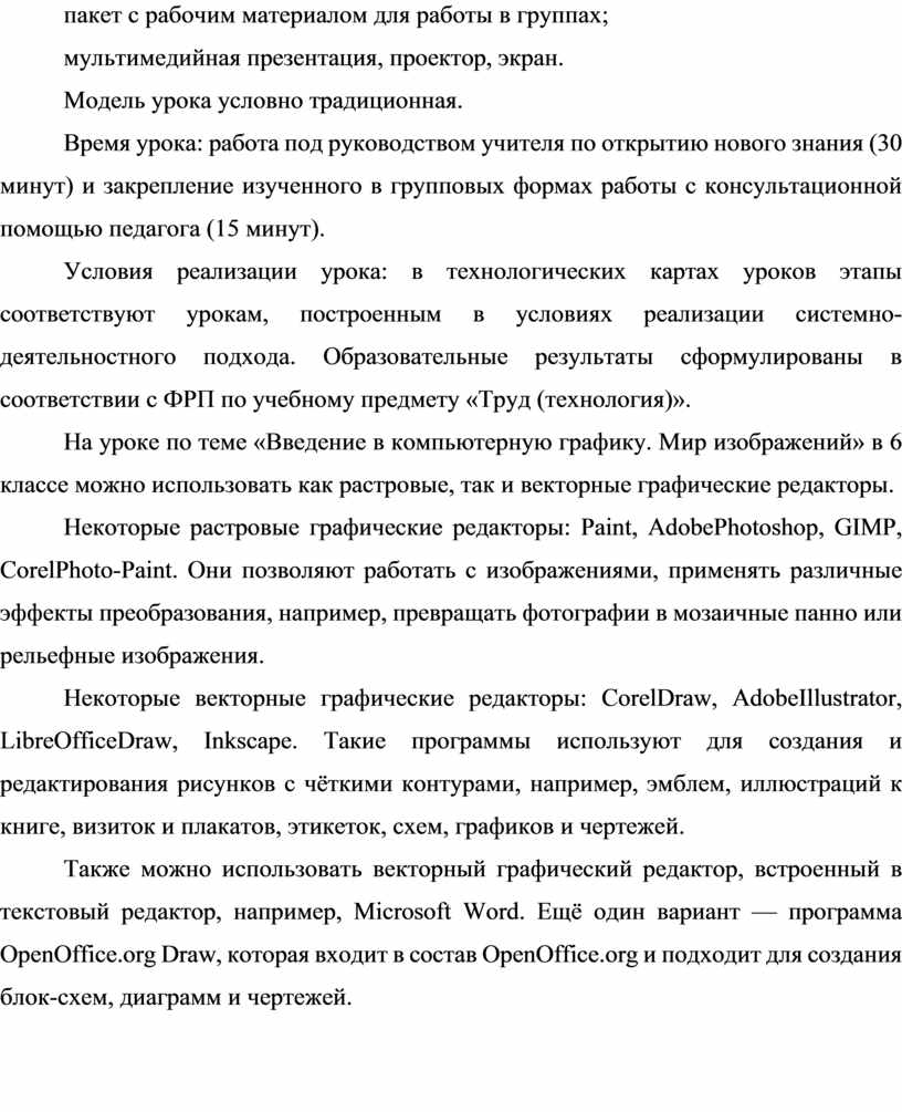Урок по теме «Введение в компьютерную графику. Мир изображений» в рамках учебного предмета «Труд (технология)» для шестого класса основан на системно-деятельностном подходе, который предполагает организацию учебной деятельности учащихся для достижения новых образовательных результатов и развития их способностей.
