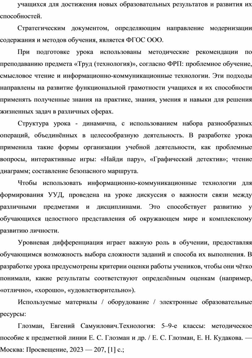 При подготовке урока использованы методические рекомендации по преподаванию предмета «Труд (технология)», согласно ФРП: проблемное обучение, смысловое чтение и информационно-коммуникационные технологии. Эти подходы направлены на развитие функциональной грамотности учащихся и их способности применять полученные знания на практике, знания, умения и навыки для решения жизненных задач в различных сферах.