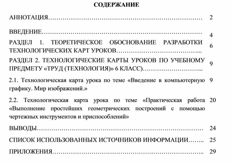 Во введении кратко приводится обоснование выбора конкретной темы, сформулированы цель и задачи, предмет, объект, методы исследования. В первом разделе кратко обосновывается соответствие уроков требованиям ФГОС, выбор цифровых ресурсов, методов и форм обучения; раскрывается замысел слушателя; содержатся дополнительные сведения об уроке. Во втором разделе представлены разработанные две технологические карты по труду (технология) для 6 класса по темам: «Введение в компьютерную графику. Мир изображений», «Практическая работа «Выполнение простейших геометрических построений с помощью чертежных инструментов и приспособлений». В выводах слушатели дали обобщение полученных результатов.