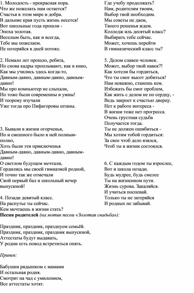 Песня родителей (на мотив песни «Золотая свадьба»):