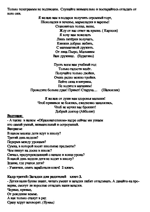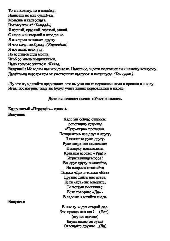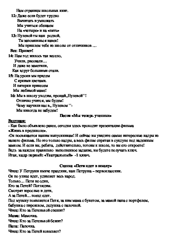 Сценарий выпускного в предшкольном классе "До свидания, предшкольный класс!" Сценарий утренника выпуска детей в школу в 1 класс. Утренник проходит в виде премьеры фильма, который показывается в конце утренника. Все роли исполняют дети. В фильме показывается весь учебный год детишек.Сценарий выпускного в предшкольном классе "До свидания, предшкольный класс!" Сценарий утренника выпуска детей в школу в 1 класс. Утренник проходит в виде премьеры фильма, который показывается в конце утренника. Все роли исполняют дети. В фильме показывается весь учебный год детишек.
