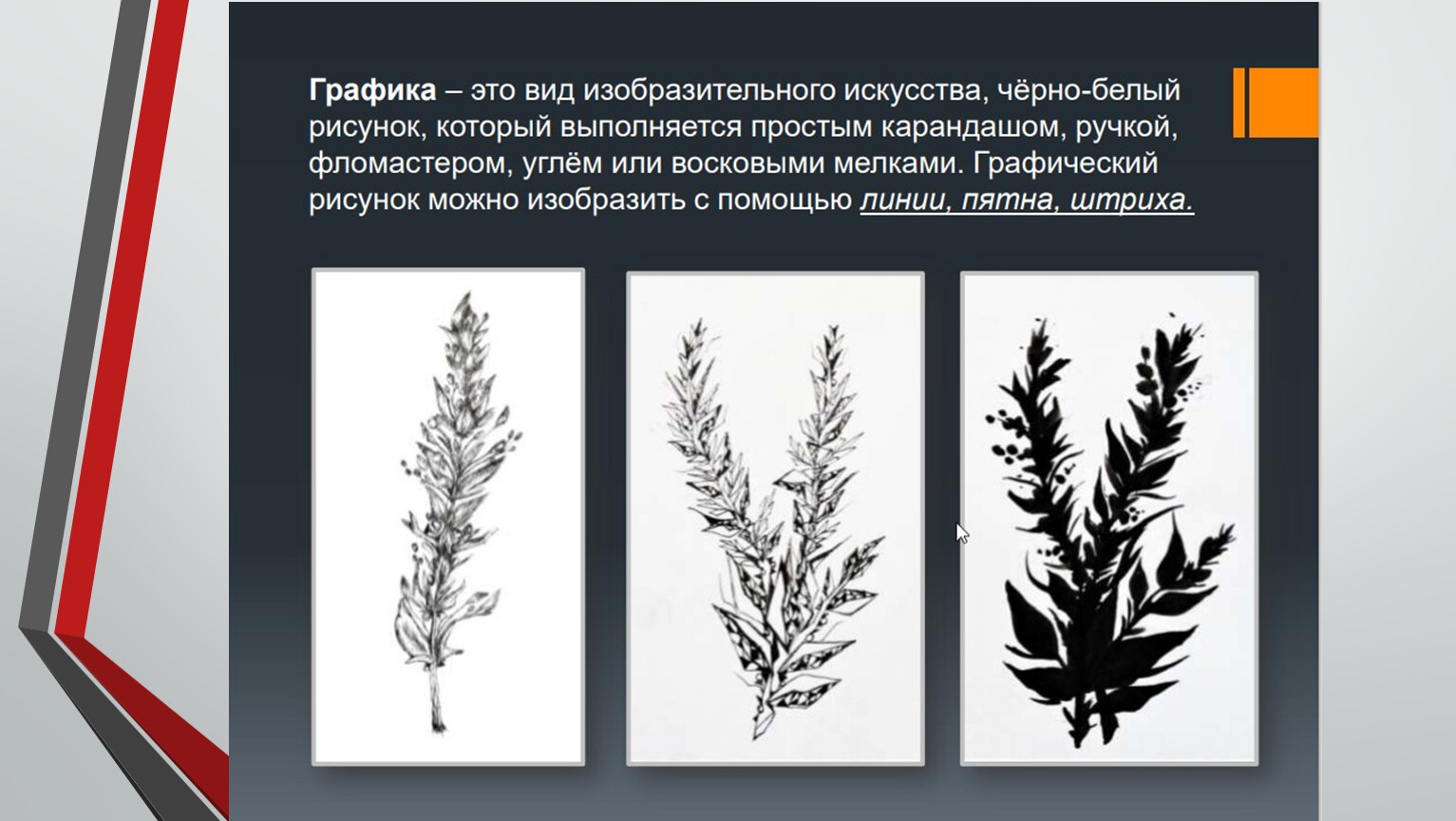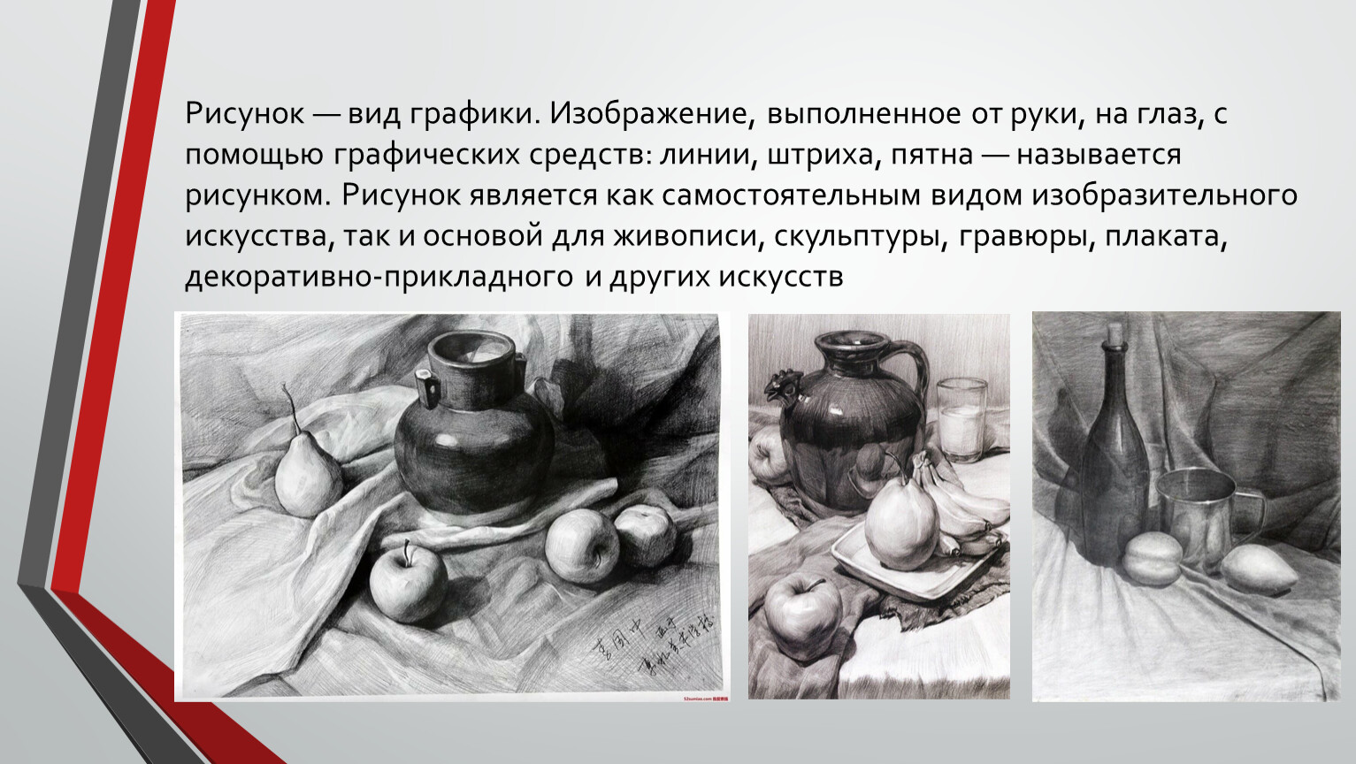 Рисунок — вид графики. Изображение, выполненное от руки, на глаз, с помощью графических средств: линии, штриха, пятна — называется рисунком. Рисунок является как самостоятельным видом изобразительного искусства, так и основой для живописи, скульптуры, гравюры, плаката, декоративно-прикладного и других искусств