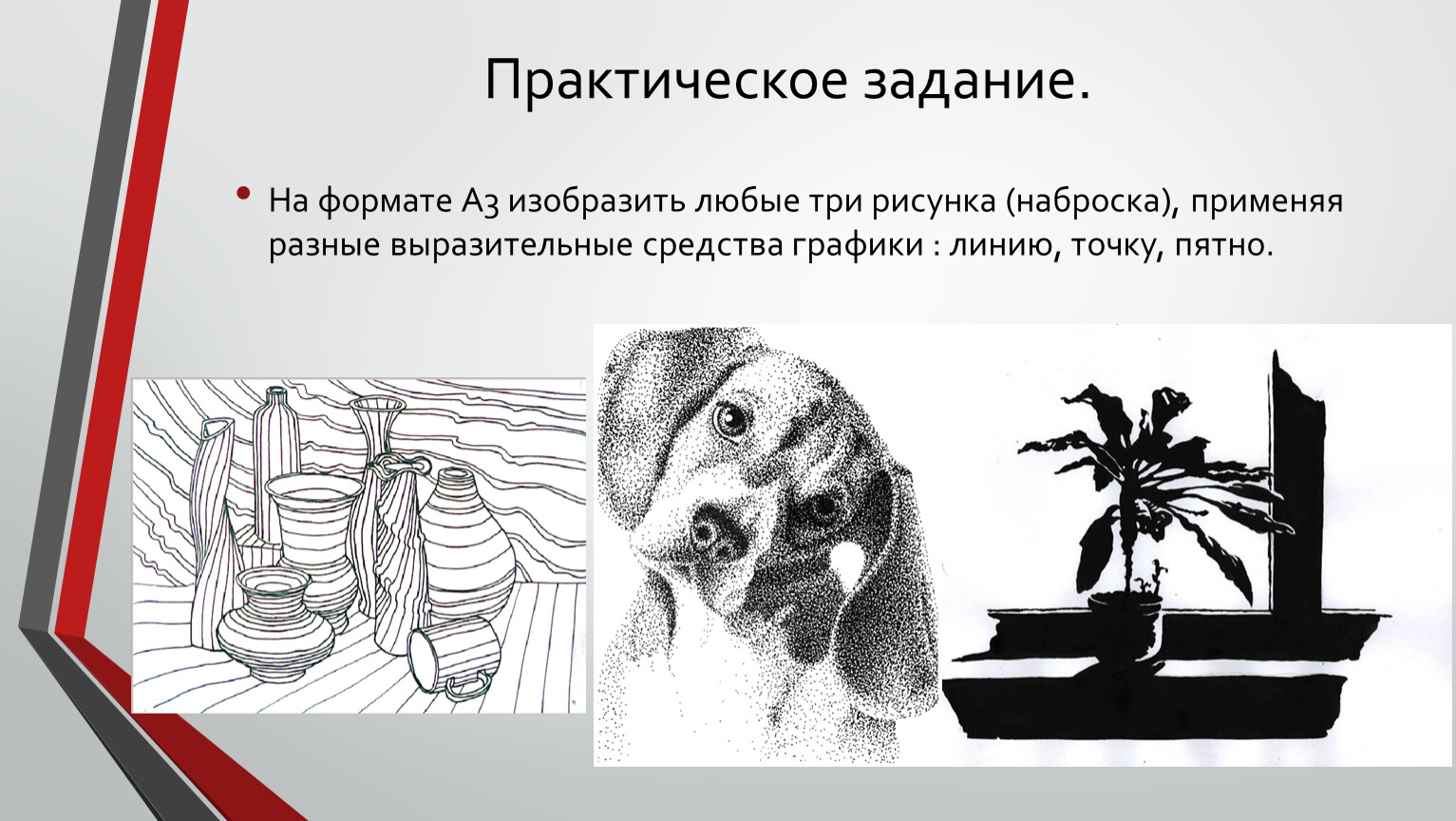 - ознакомить учащихся со способами выразительности точка, линия и пятно и их выразительными возможностями;