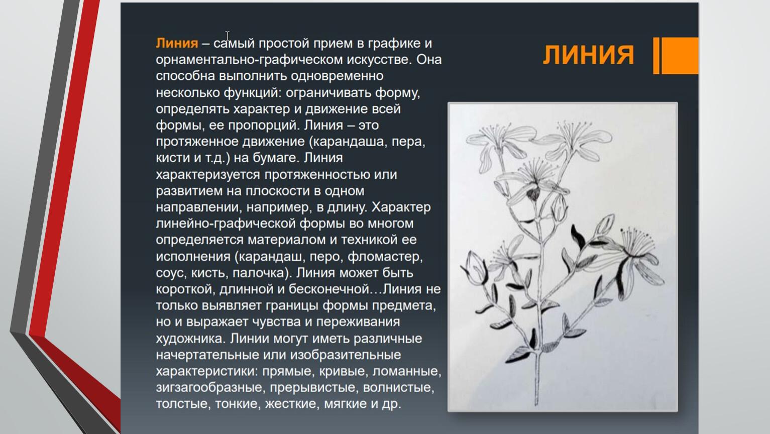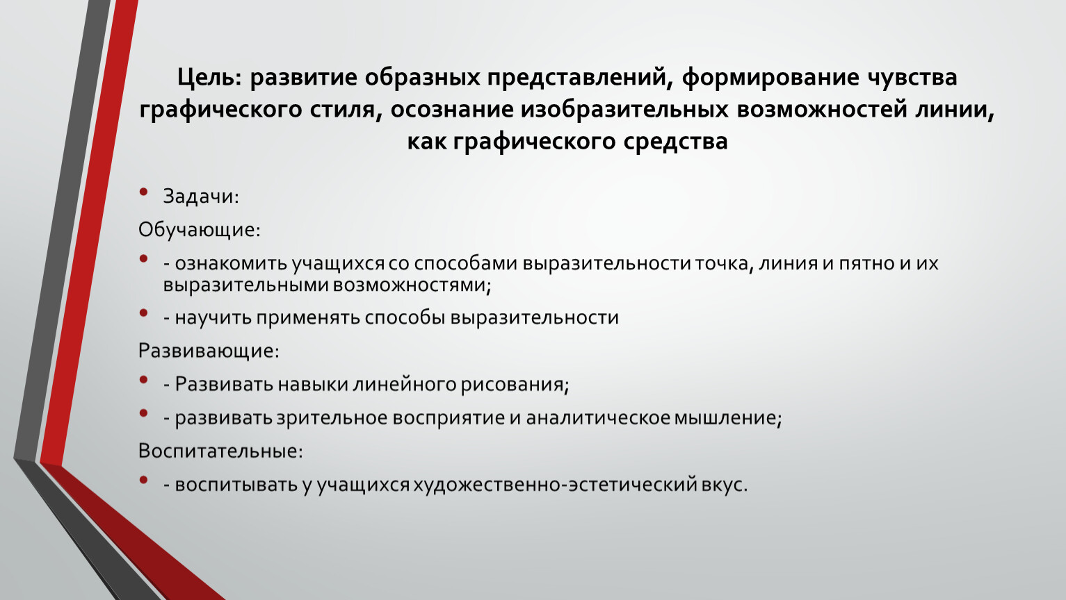 Цель: развитие образных представлений, формирование чувстваграфического стиля, осознание изобразительных возможностей линии,как графического средства