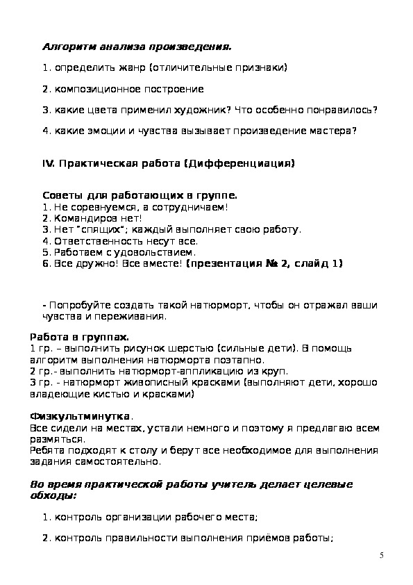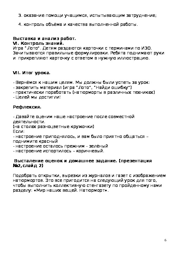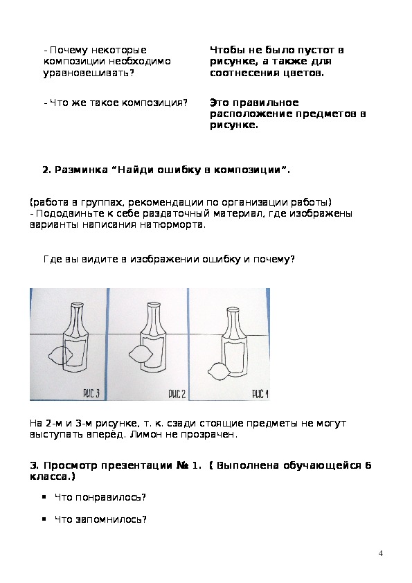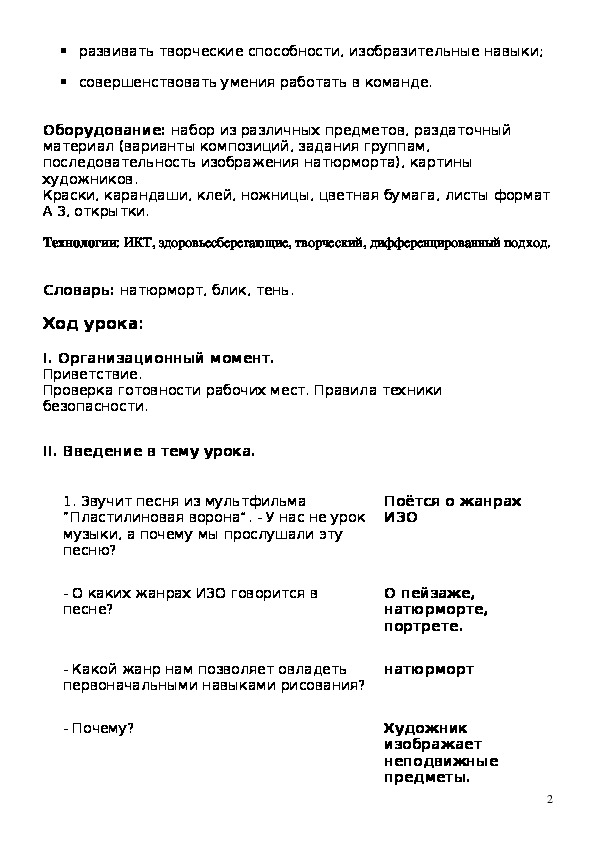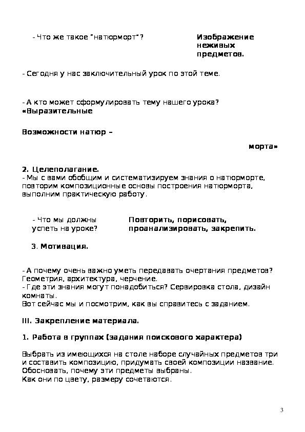 Оборудование: набор из различных предметов, раздаточный материал (варианты композиций, задания группам, последовательность изображения натюрморта), картины художников.