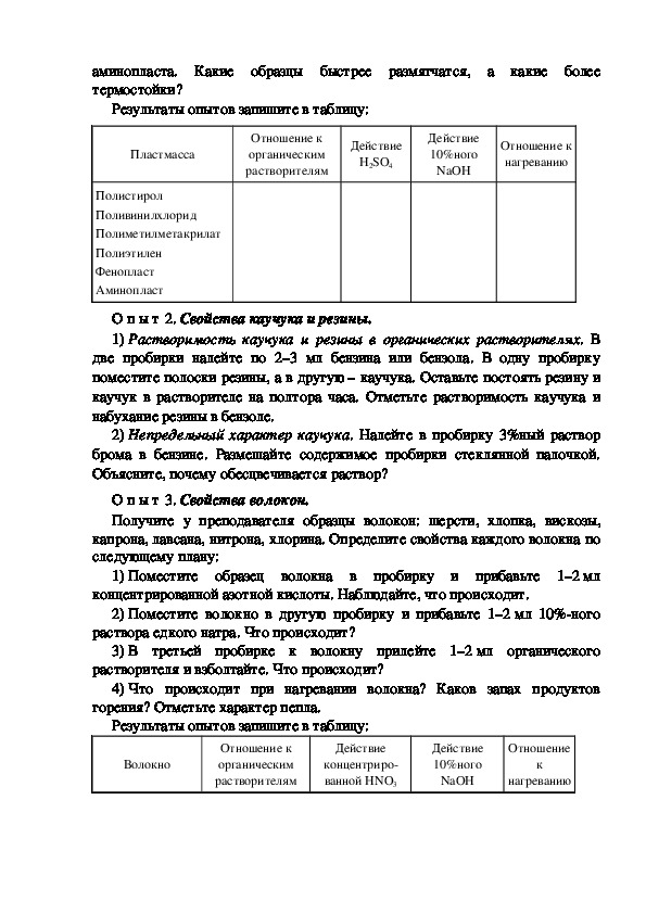 Цель работы: исследовать свойства пластмасс, каучука и волокон.