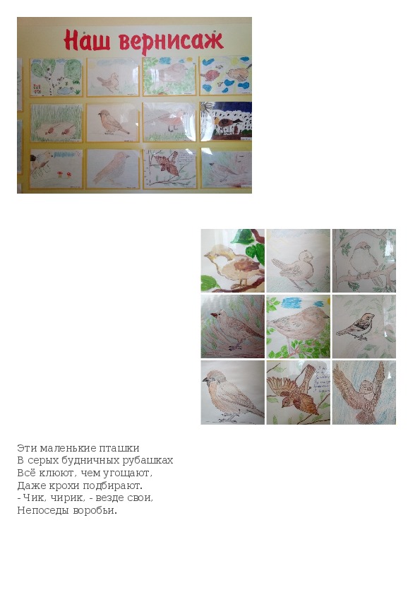 В рамках проекта «Воробьи воробушки-серенькие перышки», дети совместно с родителями приняли участие в выставке рисунков. Дети с огромным удовольствием рисовали пернатых друзей, проявляли фантазию. Благодаря проекту " Воробьи воробушки серенькие перышки" дети узнали о воробьях, много нового поучительного и интересного