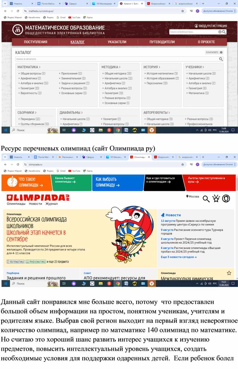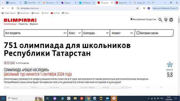 Данный сайт понравился мне больше всего, потому что предоставлен большой объем информации на простом, понятном ученикам, учителям и родителям языке. Выбрав свой регион выходит на первый взгляд невероятное количество олимпиад, например по математике 140 олимпиад по математике. Но считаю это хороший шанс развить интерес учащихся к изучению предметов, повысить интеллектуальный уровень учащихся, создать необходимые условия для поддержки одаренных детей. Если ребенок болел или по каким-то причинам не участвовал на том же школьном этапе олимпиады, то у него не было никакого шанса оказаться на муниципальном и региональном уровне. На этом сайте ребенок может достичь результаты поучаствовав в десятках других олимпиадах по тому же предмету. Удобство сайта заключается в том, что открыв любую олимпиаду, выходят задания прошлых лет, а так же решения и ответы.