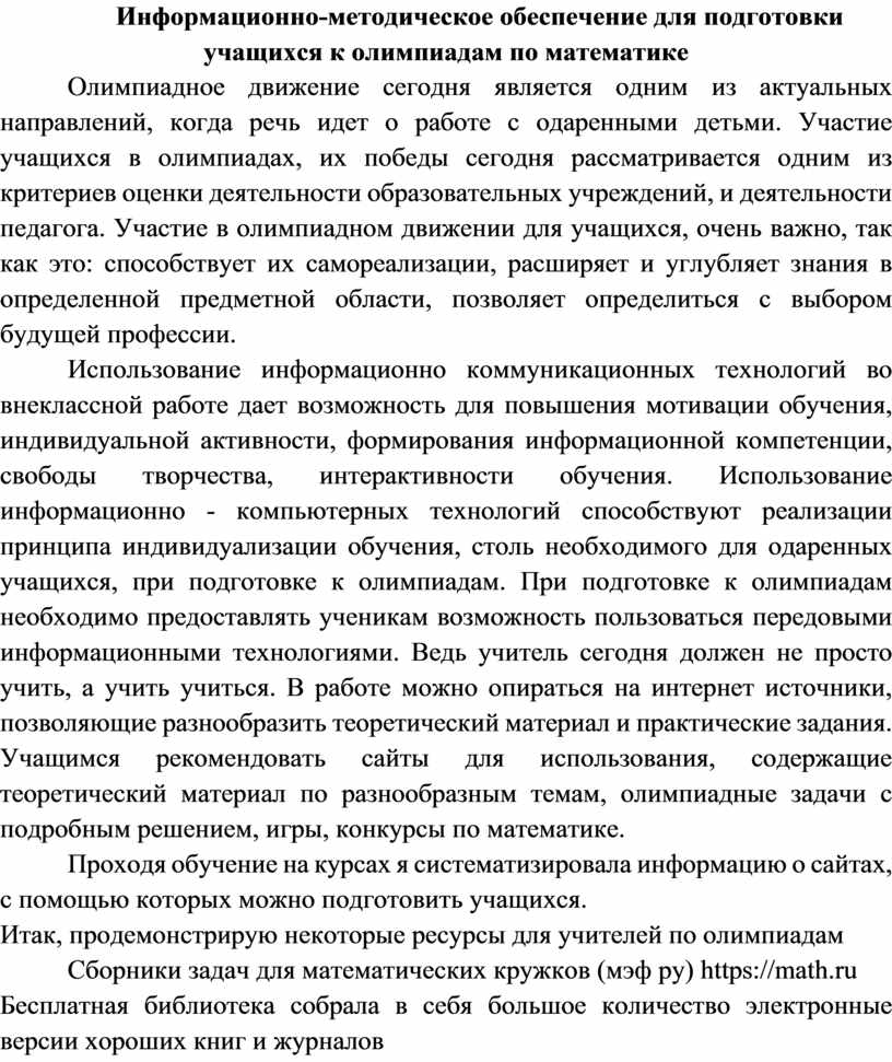Информационно-методическое обеспечение для подготовки учащихся к олимпиадам по математике