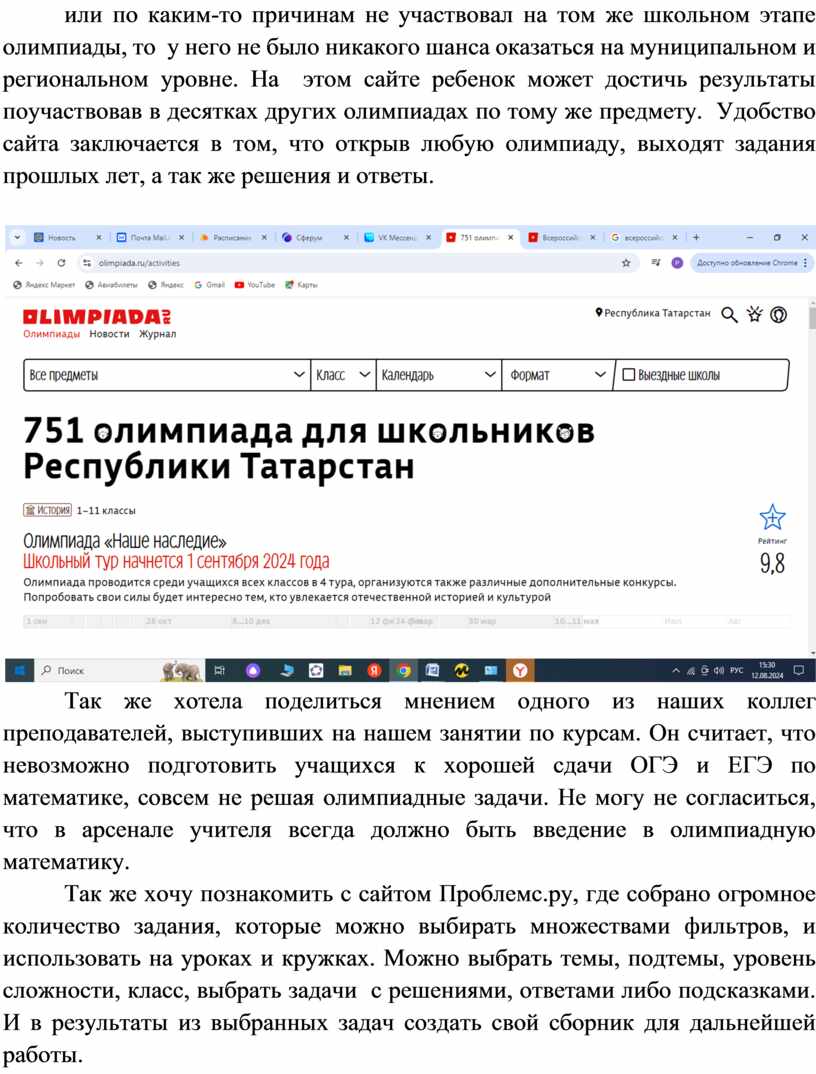 Так же хотела поделиться мнением одного из наших коллег преподавателей, выступивших на нашем занятии по курсам. Он считает, что невозможно подготовить учащихся к хорошей сдачи ОГЭ и ЕГЭ по математике, совсем не решая олимпиадные задачи. Не могу не согласиться, что в арсенале учителя всегда должно быть введение в олимпиадную математику.
