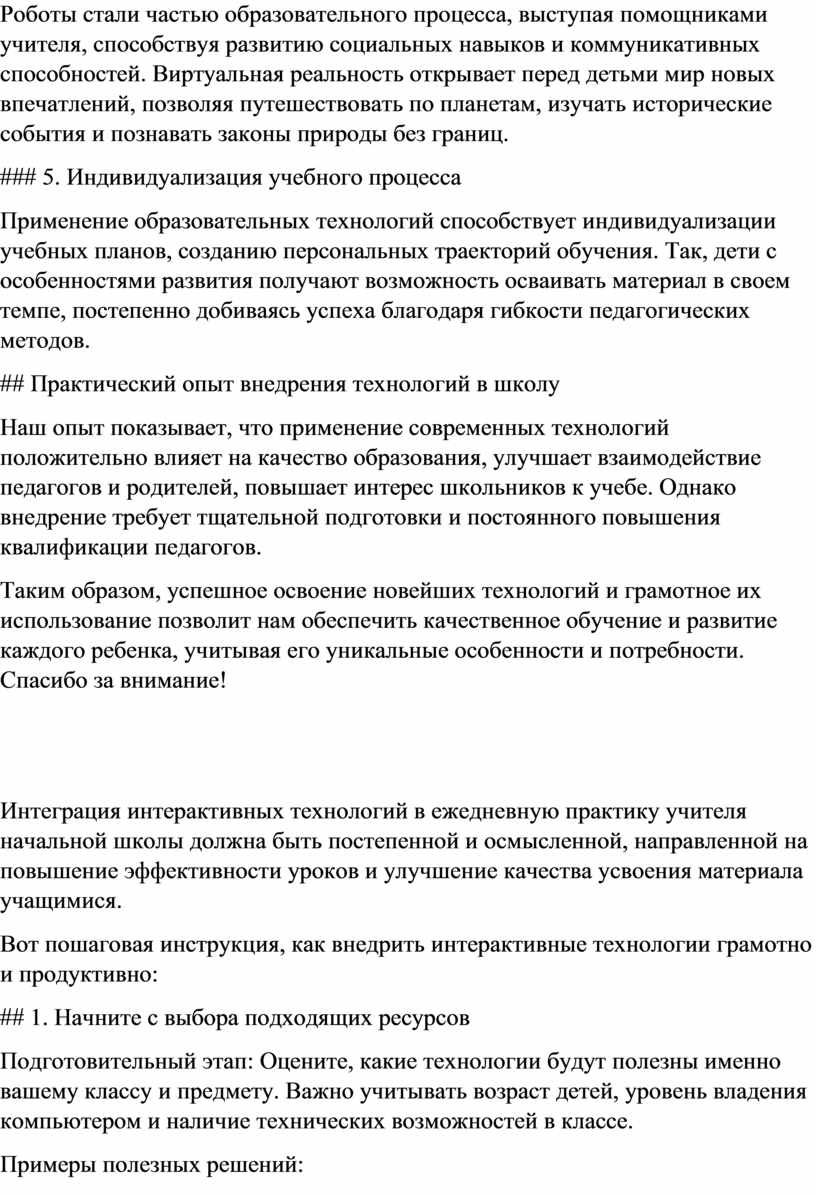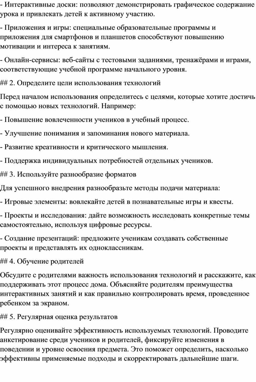 Интеграция интерактивных технологий в ежедневную практику учителя начальной школы должна быть постепенной и осмысленной, направленной на повышение эффективности уроков и улучшение качества усвоения материала учащимися.