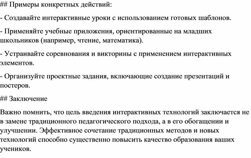 Важно помнить, что цель введения интерактивных технологий заключается не в замене традиционного педагогического подхода, а в его обогащении и улучшении. Эффективное сочетание традиционных методов и новых технологий способно существенно повысить качество образования ваших учеников.