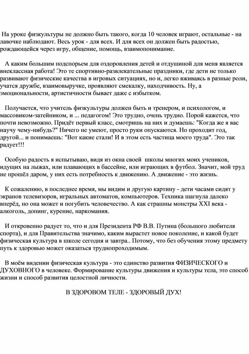 Каждый учебный предмет решает свою специфическую задачу. Так русский язык обеспечивает овладение умением писать, литература - читать, разбираться в прочитанном, математика - считать. А ЧЕМУ УЧИТ ФИЗИЧЕСКАЯ КУЛЬТУРА? Она должна, по моему мнению, учить искусству быть здоровым, вести здоровый образ жизни. В нашей работе, работе учителя физкультуры, надо исходить из интереса и потребности ребёнка, которому с рождения нужно двигаться, резвиться, падать, кричать и быть, быть здоровым! В школу дети ходят ради получения знаний, а на уроки физкультуры - ради укрепления здоровья и физического развития, и надо это в первую очередь не учителю, а именно им. А что в реальности? Болеют дети всё больше и больше. Здоровье нации падает и падает. Оно деградирует. А чем всегда был силён и могуч русский народ? Здоровьем и силой духа! Победа в Отечественной войне 1812 года, победа в Великой Отечественной войне 1941-1945 гг. - это победы здорового, закалённого душой и телом народа. Так что же делать? Да просто не сидеть, сложа руки. Надо с первых уроков детей в школе учить их трудиться. Человек рождается на свет, вместе с ним рождается лень, и всю свою жизнь человек борется со своей ленью. Ведь правильно звучит цитата из известной детской книжки Б. Заходера "Мишка - топтыжка": "Если хочешь чему-то научиться, надо очень сильно захотеть и немножко попотеть!" Как же сделать так, чтобы ребёнок трудился, не принуждая его к этому? Вот в чём проблема. Я думаю, всё напрямую зависит от учителя, от его желания и умения. Ведь физическая культура - это урок, на котором, как ни на одном другом, учащиеся могут отследить реальные результаты своего развития. на своих уроках часто повторяю: "Нет учеников неспособных, а есть трудолюбивые и ленивые", - и поэтому прилагаю максимум усилий, чтобы заинтересовать, убедить, научить каждого ученика трудиться не только на уроке, но и дома. Ребёнок должен ХОТЕТЬ, МОЧЬ и УМЕТЬ - эти три принципа, по моему мнению, могут обеспечить интерес ребёнка, а, соответственно, и его участие в работе. "Хотеть" - это постоянное желание ребёнка делать что-то на уроке. Он приходит на урок, потому что ему интересно, комфортно; потому что он уверен, что будет непосредственным участником, а не наблюдателем. А чтобы желание быть участником не пропадало, в каждом уроке должна быть "изюминка". Именно она запоминается, и желание прийти на следующий день подогревается интересом к чему-то необычному. "Мочь" - это тот реальный индивидуальный показатель здоровья ребёнка, из которого приходится исходить учителю при построении урока на протяжении всего учебного периода в школе. "Уметь" - этот показатель, безусловно, определяется мастерством учителя, насколько он, как педагог, способен донести свои профессиональные знания до ученика, чтобы ребёнок научился применять их на практике. У каждого, по моему мнению, есть своя "планка" - тот самый личный предел, освоить который вполне по силам. И самое главное - развивать желание на этих достижениях не задерживаться.