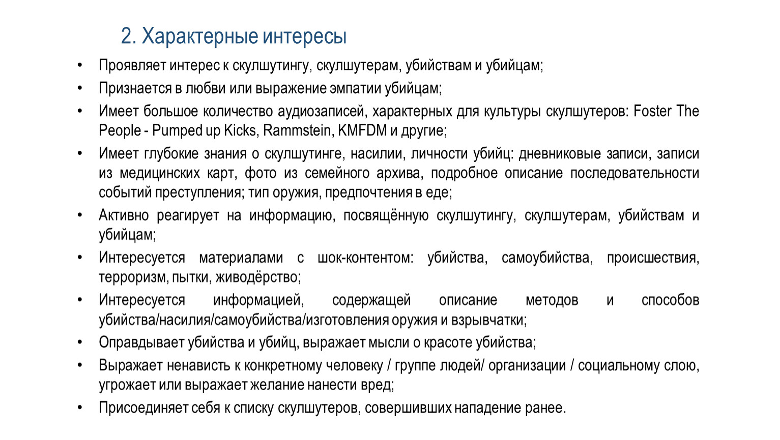 Активно реагирует на информацию, посвящённую скулшутингу, скулшутерам, убийствам и убийцам;
