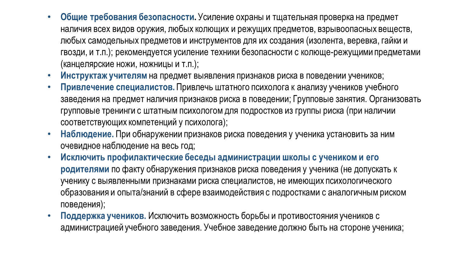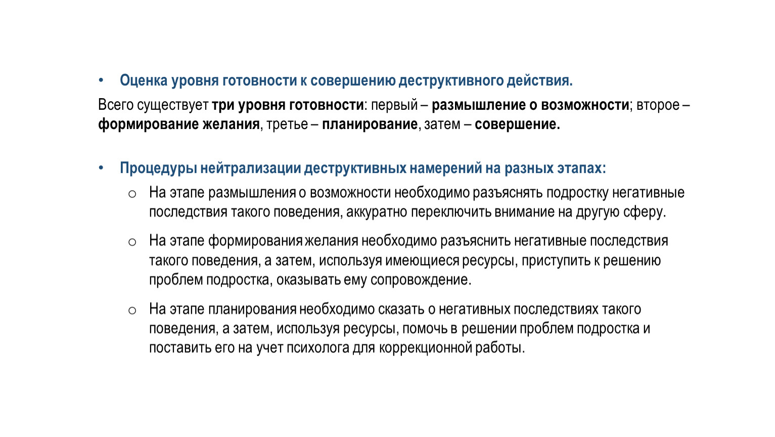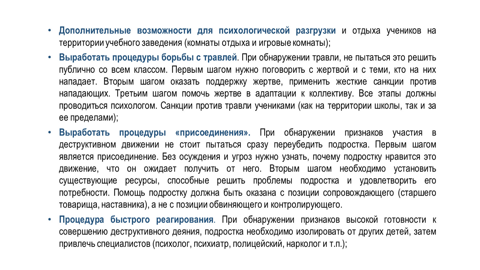 Процедура быстрого реагирования. При обнаружении признаков высокой готовности к совершению деструктивного деяния, подростка необходимо изолировать от других детей, затем привлечь специалистов (психолог, психиатр, полицейский, нарколог и т.п.);