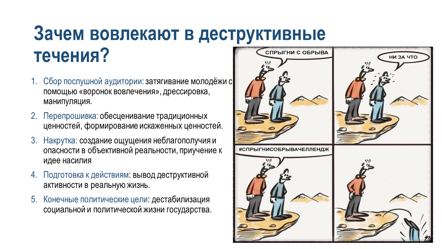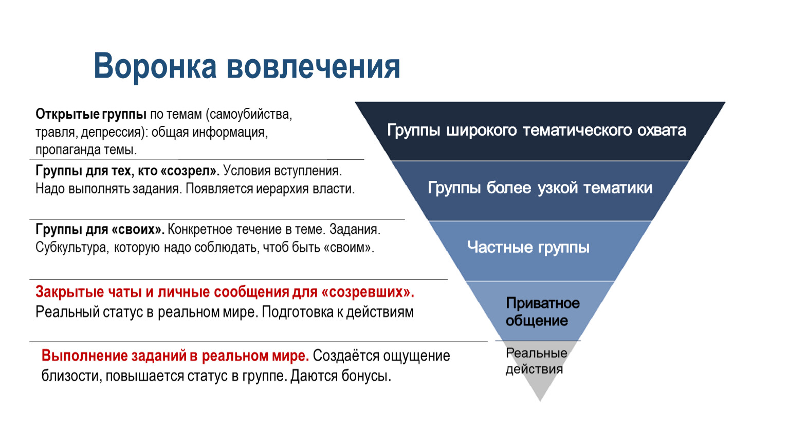Сбор послушной аудитории: затягивание молодёжи с помощью «воронок вовлечения», дрессировка, манипуляция.