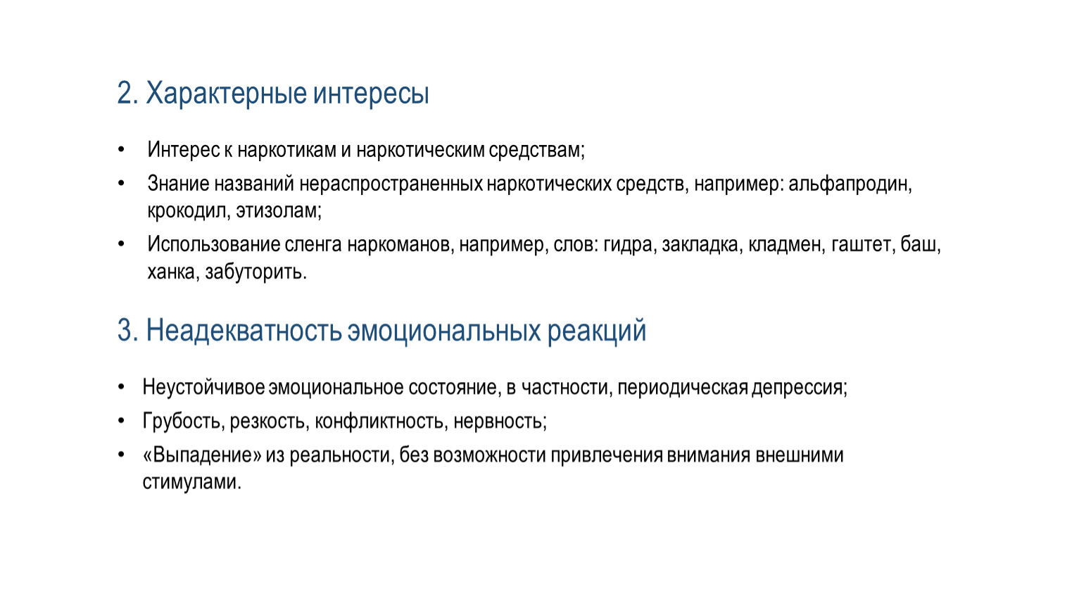 Физиологические маркеры употребления наркотиков. Индивидуально для каждого наркотического средства: расширенные/суженные зрачки, сухость губ, бледность кожных покровов.