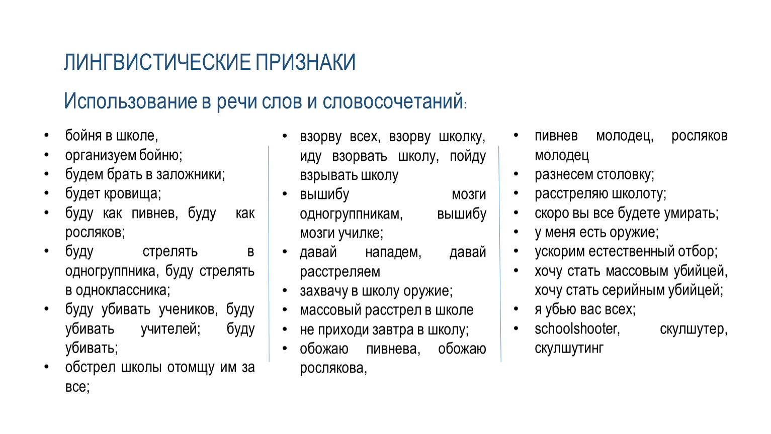 Выражение желания нападения на школу; угрозы убийства / расстрела / подрыва одноклассникам, учителям, другим людям; прямое предупреждение окружающих о подготовке нападения;