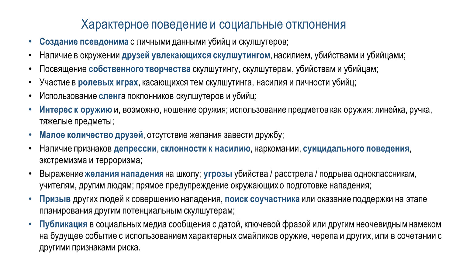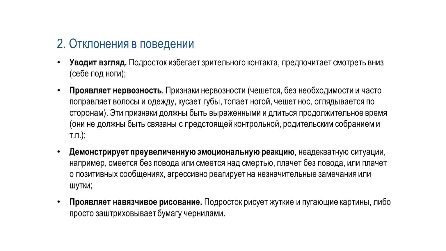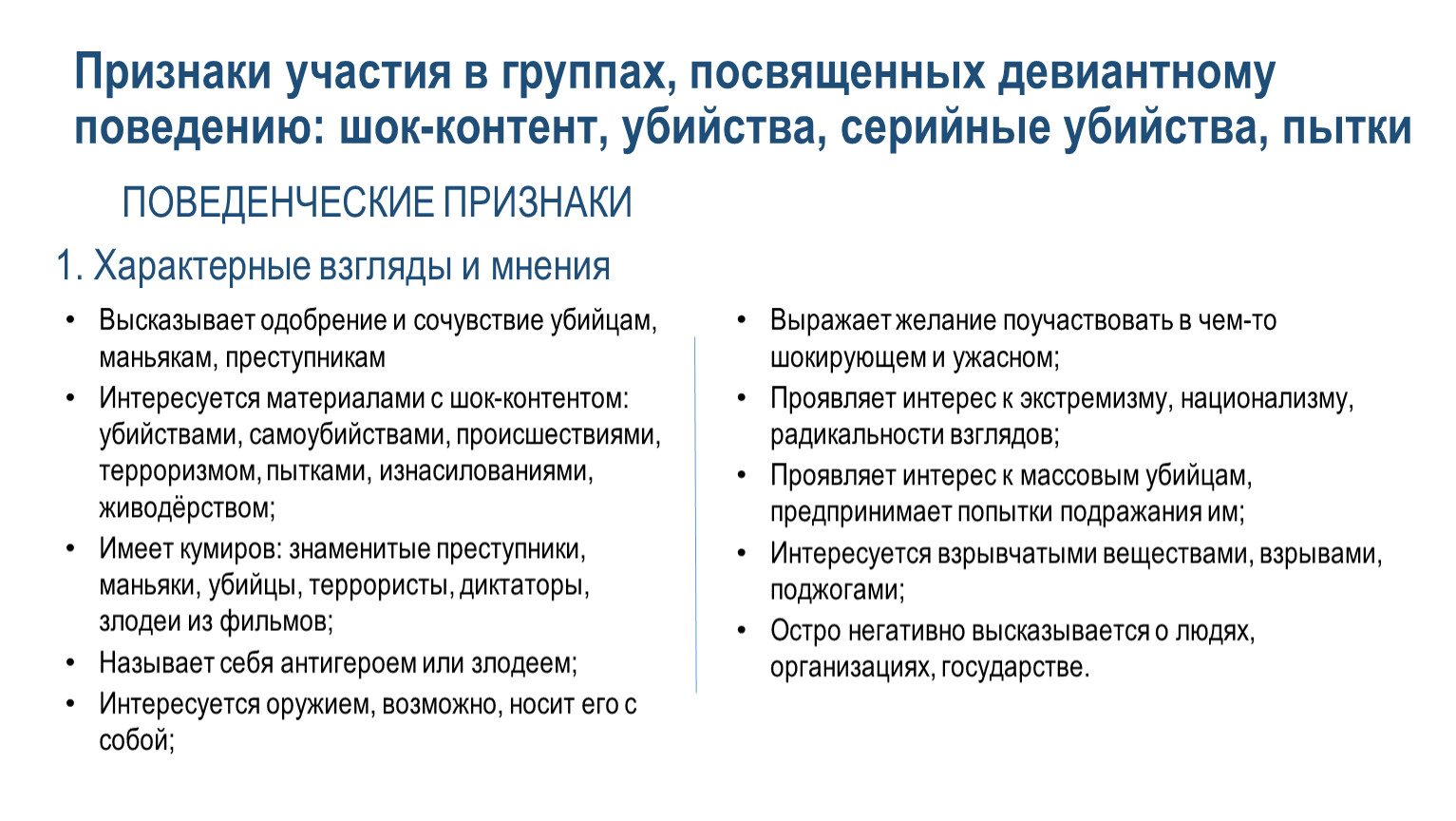 Наличие признаков депрессии, склонности к насилию, наркомании, суицидального поведения, экстремизма и терроризма;