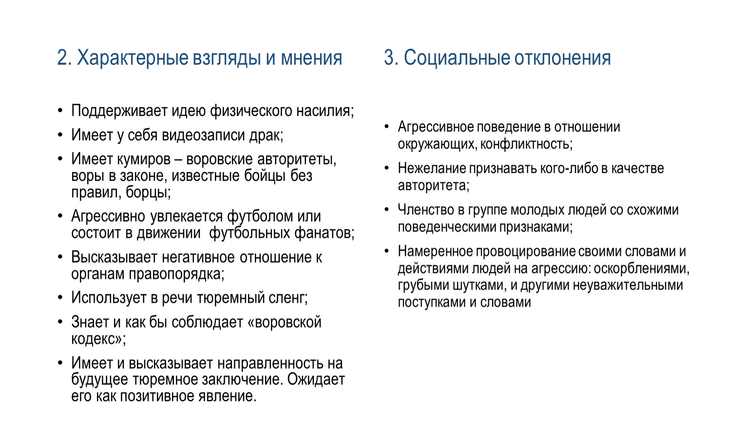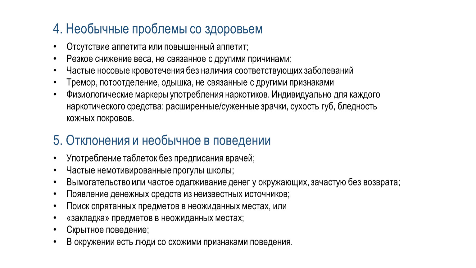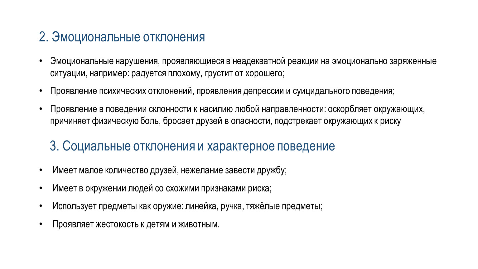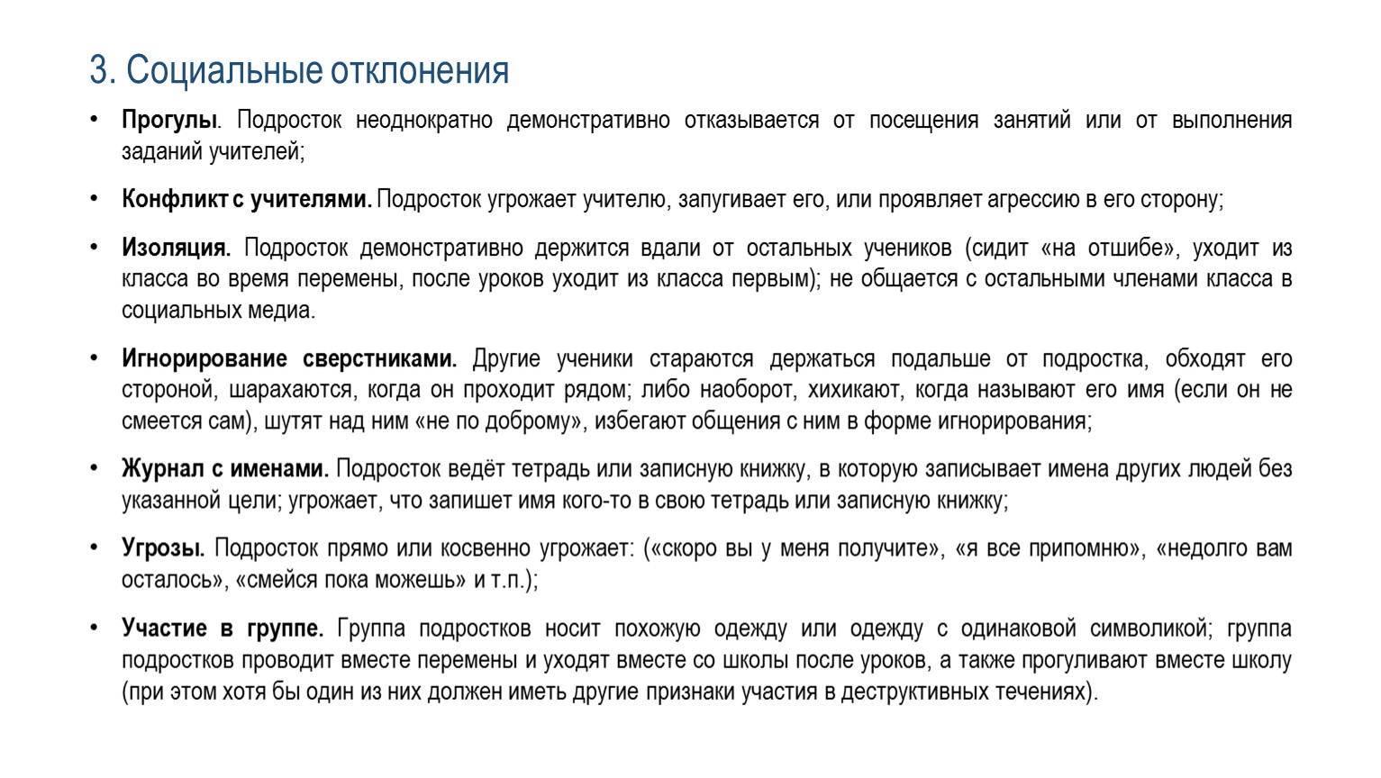 Наличие признаков депрессии, склонности к насилию, наркомании, суицидального поведения, экстремизма и терроризма;