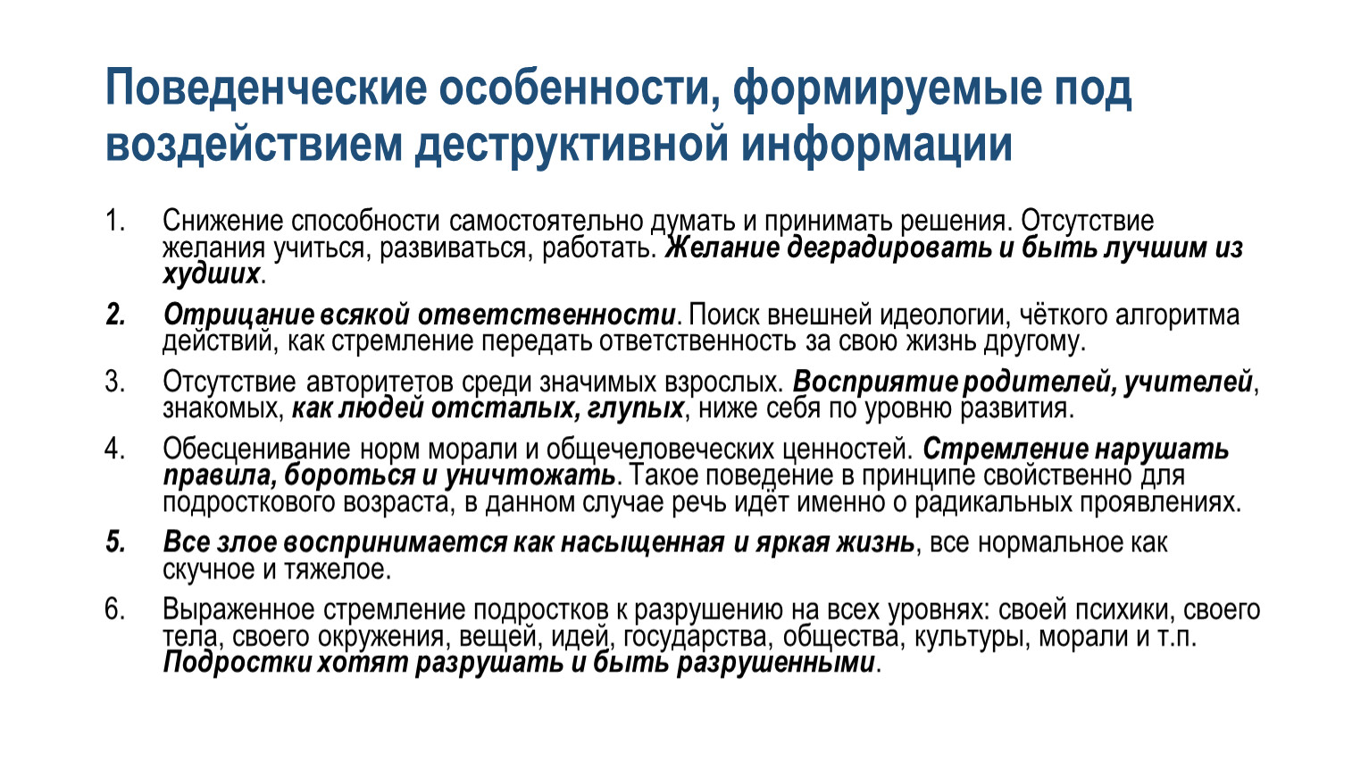 Поведенческие особенности, формируемые под воздействием деструктивной информации